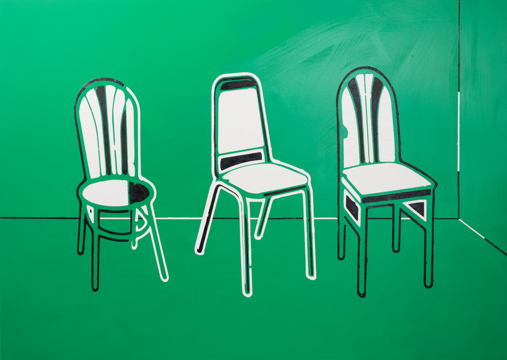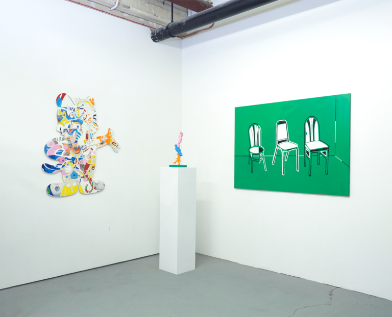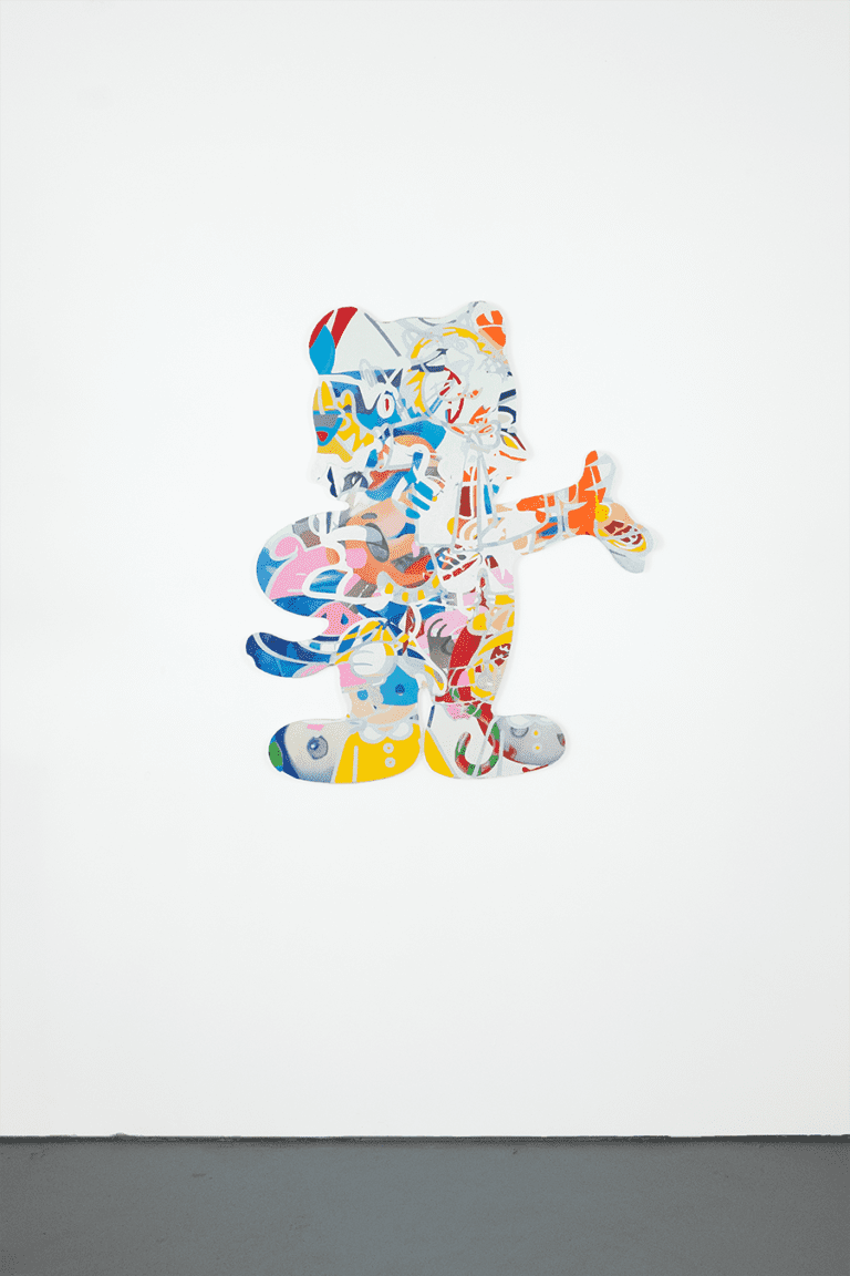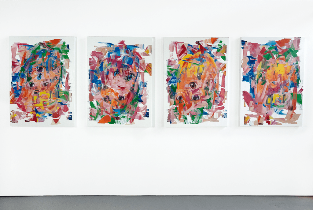 These works find new narratives within branding by placing pictures in violation of their intended reading to reveal the syntactics of vectorized messaging. The paintings implement digital inkjet printing combined with traditional painting techniques, weaving intricate layers of stenciled paint on the printed canvas, contrasting thickly painted graphics with soft digital brushstrokes.