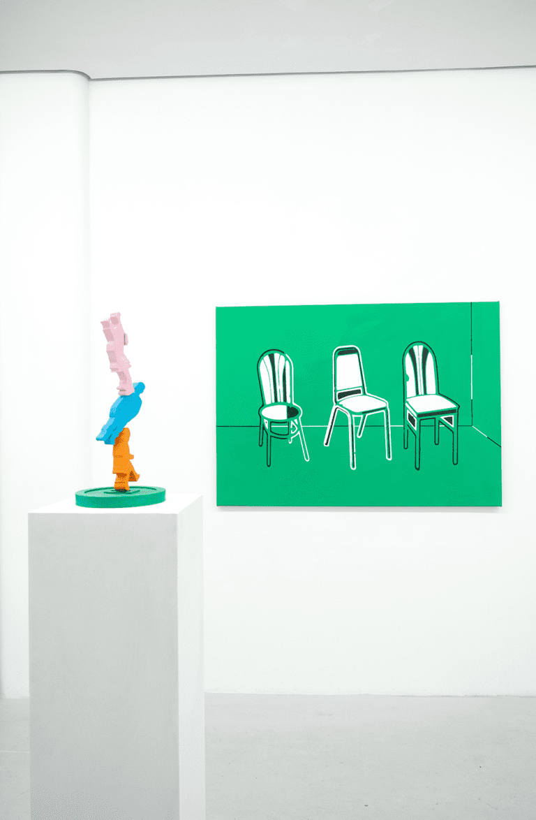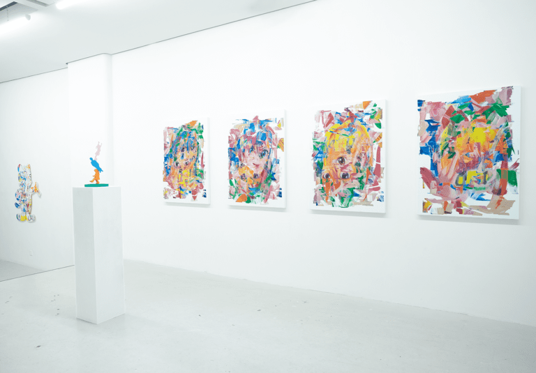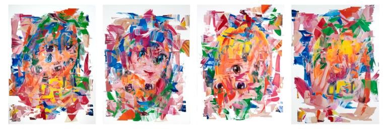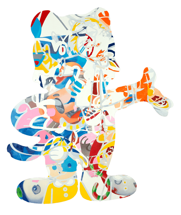 These works find new narratives within branding by placing pictures in violation of their intended reading to reveal the syntactics of vectorized messaging. The paintings implement digital inkjet printing combined with traditional painting techniques, weaving intricate layers of stenciled paint on the printed canvas, contrasting thickly painted graphics with soft digital brushstrokes.